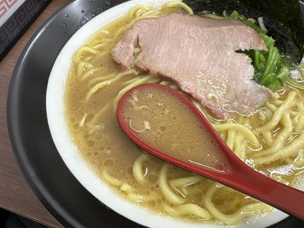 スープはとろっとかなり乳化の進んだ豚骨醤油味。骨密度高めで文字通り骨太な味わい。タレが控えめで出汁が主役。百麺そのままと言って過言ではないクオリティ高い味わいでとても美味しい!