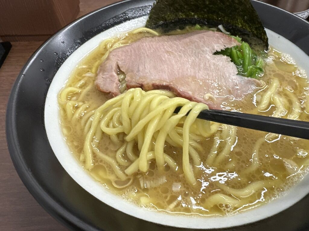 麺はストレート中太タイプ。先頭メニューの太麺にしましたが、出身店での人気は、家系ラーメンで博多ラーメン風の麺が楽しめる細麺なんですよね。今回の太麺はかなり固めのゆで加減で、強靭なコシが堪能できます。