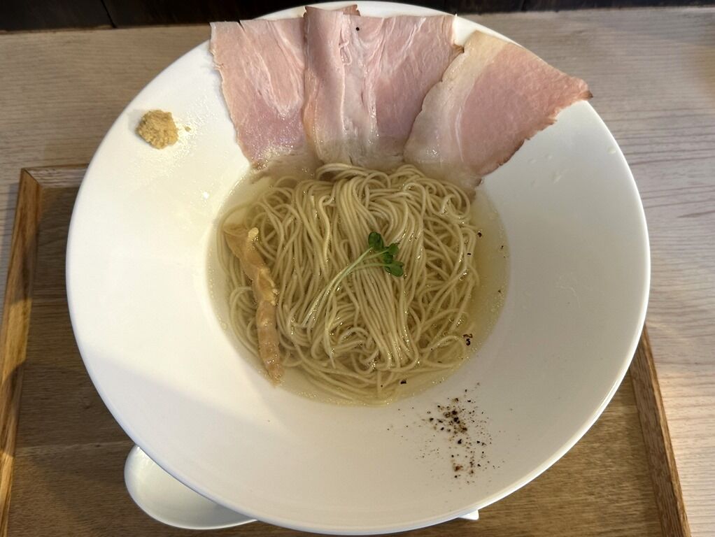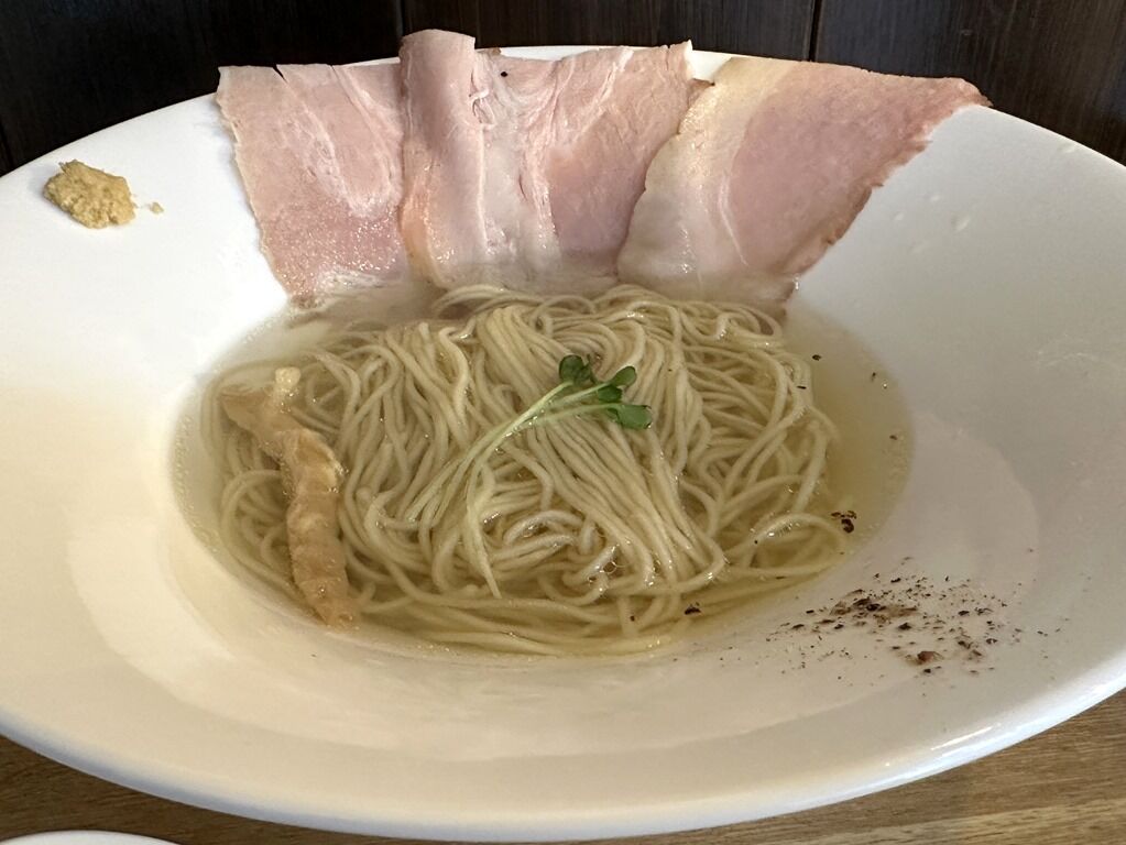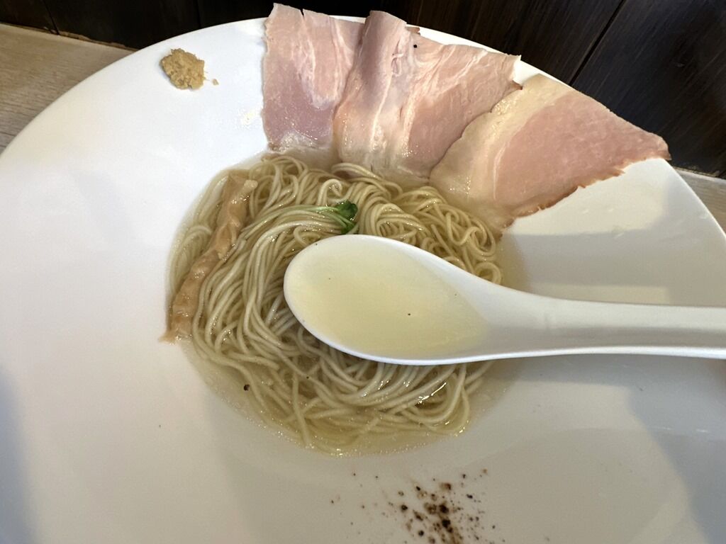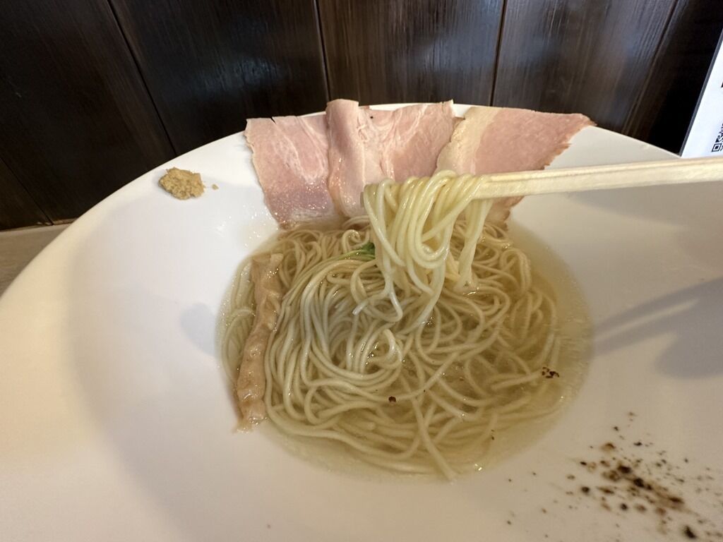 スープはさらさらの清湯塩味。器の底が透けて見えそうなほど透明でクリアなスープ。鶏清湯で淡麗なビジュアルですが塩っけは強めで不足感はありません。鶏の旨みと塩分がしっかりあって、ラーメン的にも満足感のある一杯。生ハムっぽい低温調理チャーシュー(ペロンチャーシュー)もスープに実に良く合って旨いです。