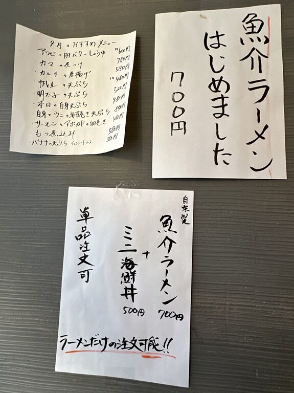 メニューは大崎店のクリアラーメン・濃厚味噌ラーメンを踏襲しつつ、大崎店限定のまぜそばをレギュラーで提供。さらに魚介ラーメン700円、海鮮丼500円も新規リリース。