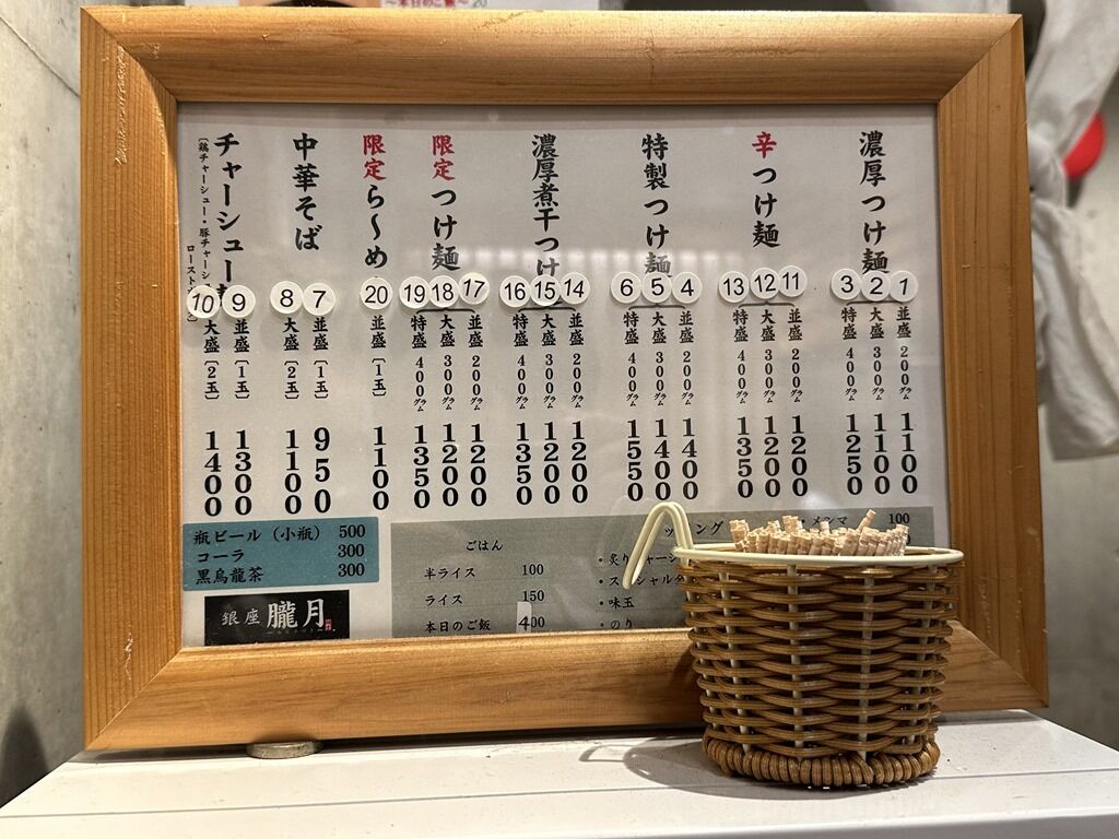 主なメニューは、濃厚つけ麺並盛・大盛1100円・特盛1250円、濃厚煮干つけ麺並盛・大盛1200円・特盛1350円、塩つけ麺並盛・大盛1200円・特盛1350円、中華そば並盛950円・大盛1100円、ローストポーク丼400円、他。