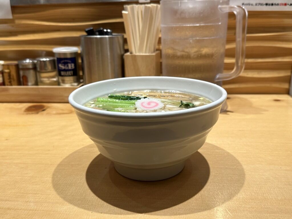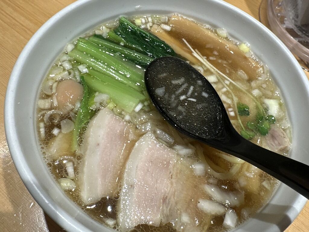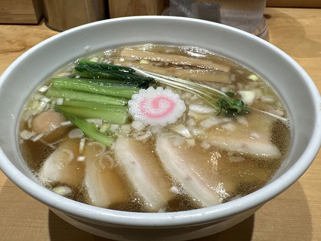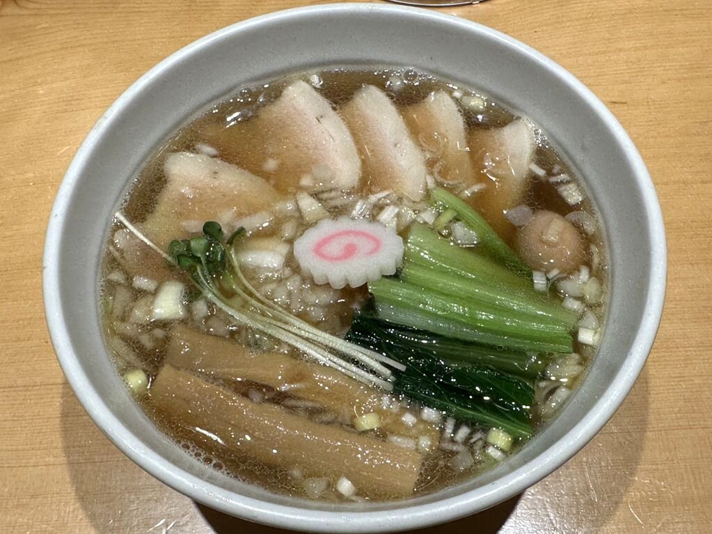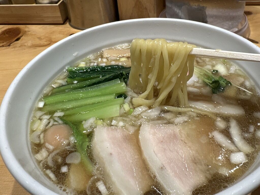 スープはさらさらの清湯醤油味。煮干しが軽く効いて程良く和風の食べやすいシフト。4年前オープン直後にいただいたビジュアルや味とほぼ変わらない仕立てでとても美味しい!