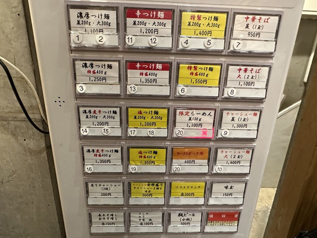 麺量はつけ麺並盛200g、大盛300g、特盛400g、中華そば並盛1玉、大盛2玉。