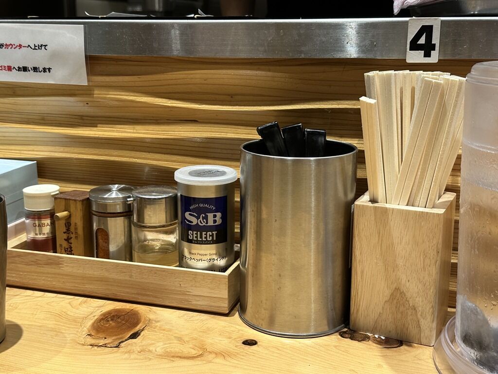 BGMはJ-POP、ライラック、他♪箸は割り箸。卓上調味料はGABAN柚子唐辛子、原了郭黒七味、一味唐辛子、酢、S&Bブラックペッパー。