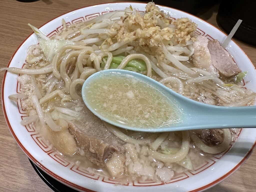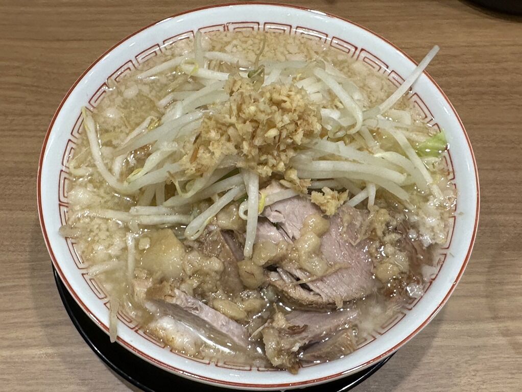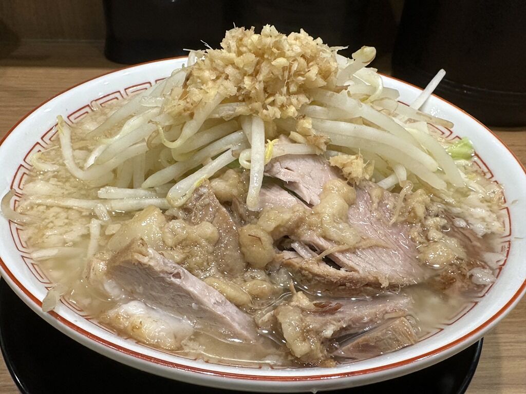 具はホロホロの豚がたっぷり、もやしメインのヤサイ、背脂、頂上にこんもり盛られるのはニンニクではなくきざみしょうが。デフォでニンニクは入りません。