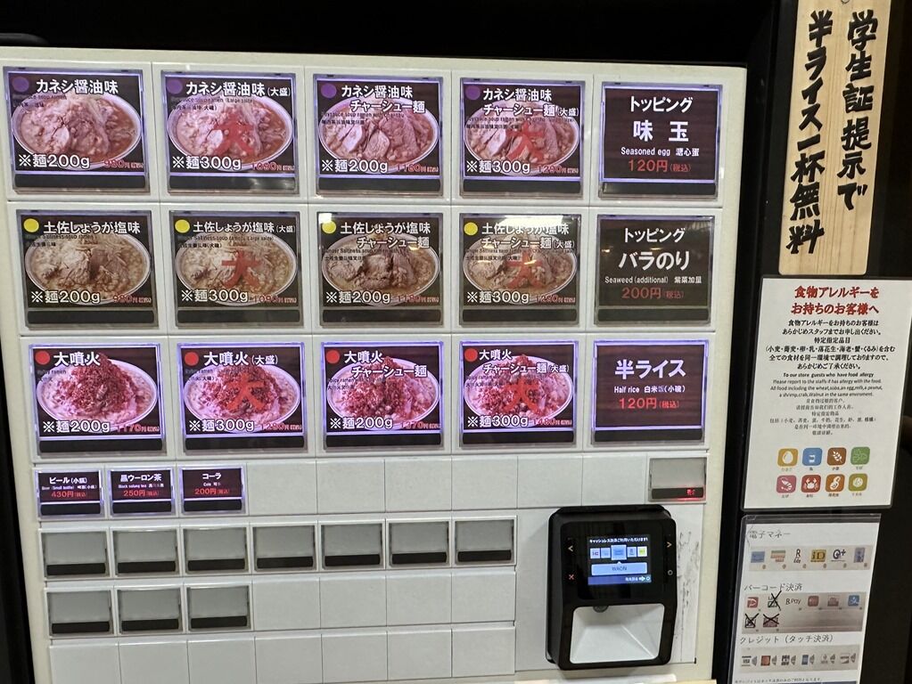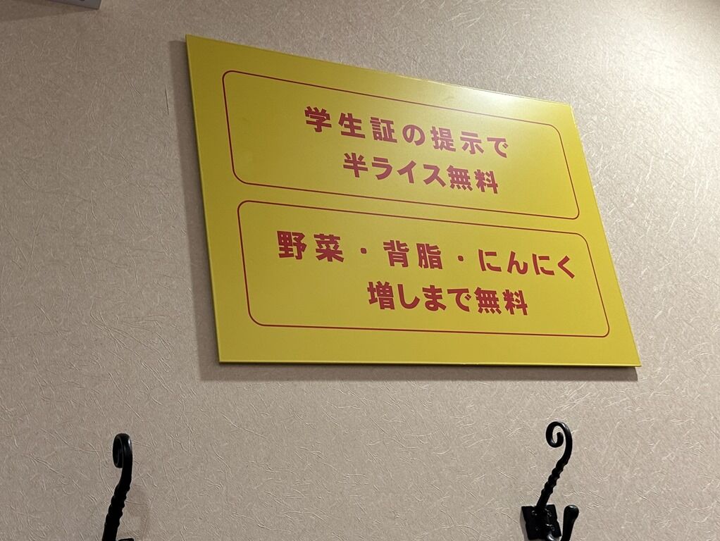 学生証提示で半ライス一杯無料サービス。大噴火は醤油の辛いバージョン。麺量普通盛200g大盛300g+110円。麺少なめ、麺半分もOK。