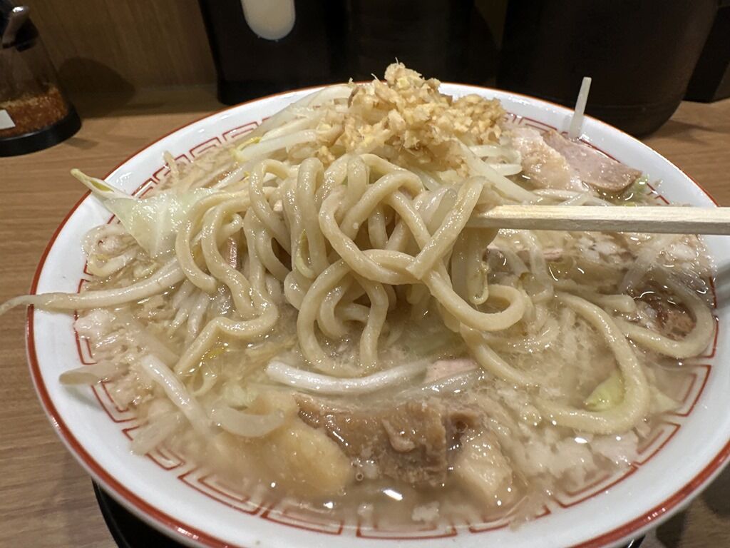 麺はあさひや製の大きくウェーブの付いた太麺。しっかりとゆできってあり、ゴワゴワではなくモチもちっとしたコシが楽しめます。