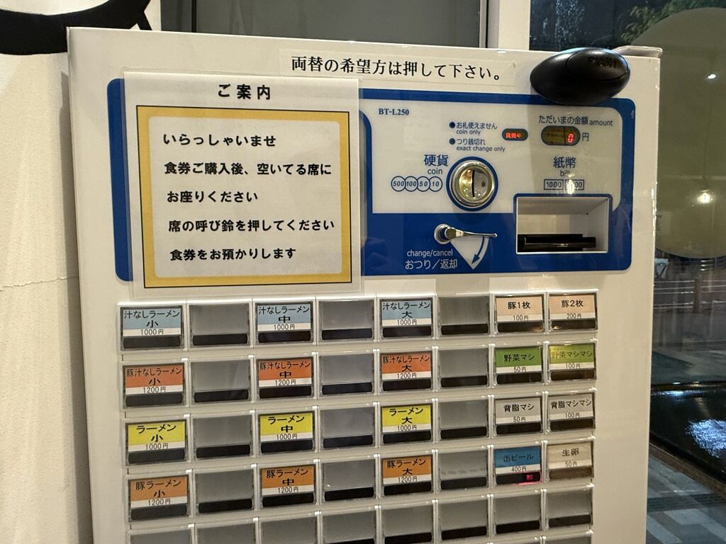 入店するとまず券売機で食券購入です。主なメニューは、汁なしラーメン/ラーメン小・中・大1000円、野菜マシ・背脂マシ・生玉子50円、他。先頭メニューはラーメンではなく汁なし。