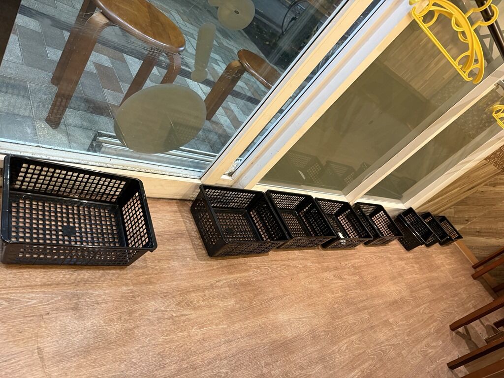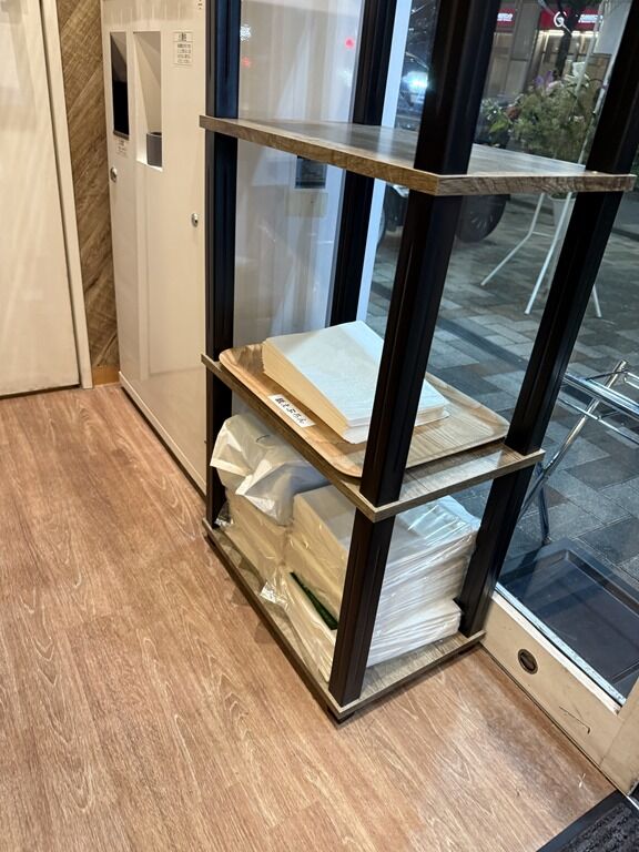 紙エプロンは券売機横からセルフで。荷物かごは通路壁沿いに配置。