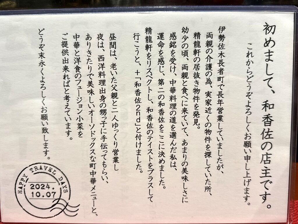 「和香佐」は伊勢佐木長者町で創業32年。両親の介護のため実家近くへ移転が必要となり、2024年3月22日で閉店。移転先は店主さんが幼少のころ両親に連れられ食べに来て感銘を受け、中華料理の道へ進むことを決めた「精龍軒」跡地。まさに運命を感じて第二の「和香佐」をこの地に決定。