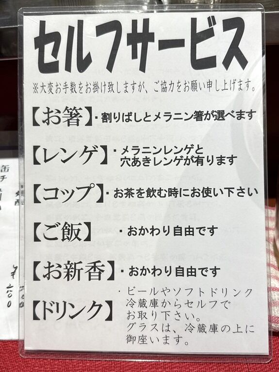 お冷代わりのお茶は麦茶。箸はセルフコーナーから割り箸と洗い箸のどちらかをチョイス。レンゲはやはりセルフコーナーからノーマルタイプと穴あき版が利用可能。