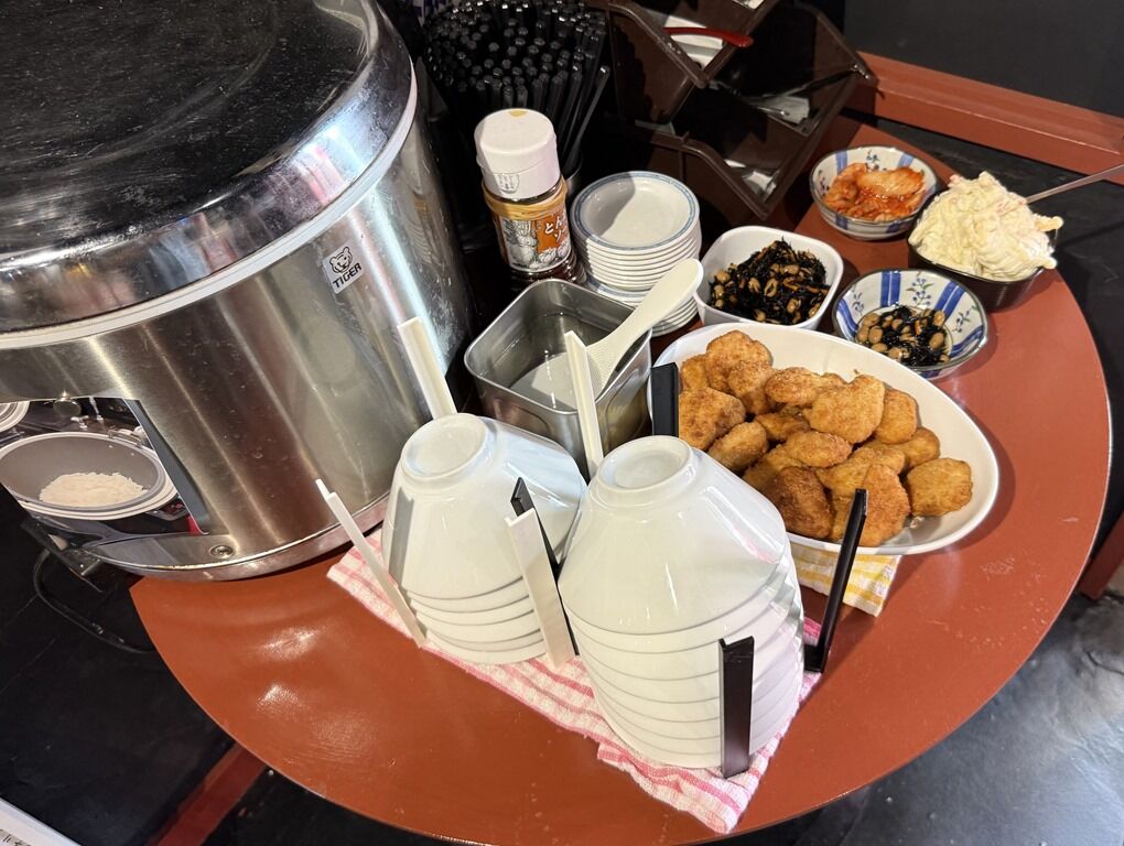 特筆すべきは、セルフコーナーにあるライス、チキンナゲット、ひじきと豆の煮物、キムチ、マカロニサラダが食べ放題。このご時世、ランチタイム半ライスサービスするお店も減っている中、すんごい太っ腹。