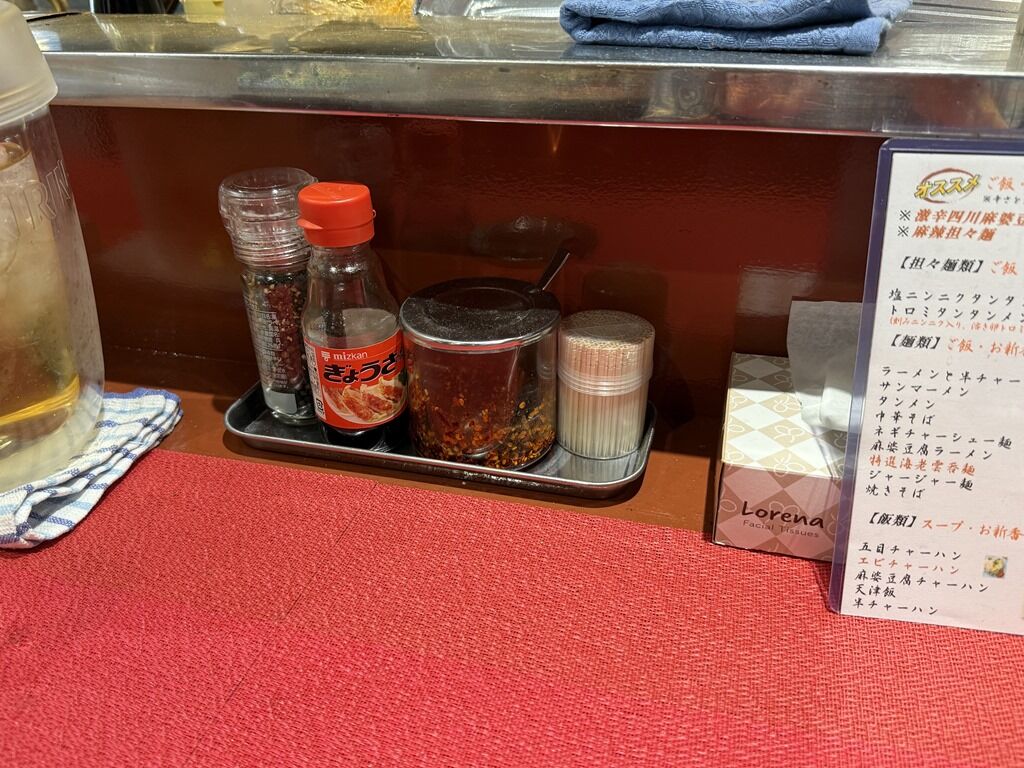 卓上調味料はペッパーミル入りブラックペッパー、餃子のタレ、食べるラー油。