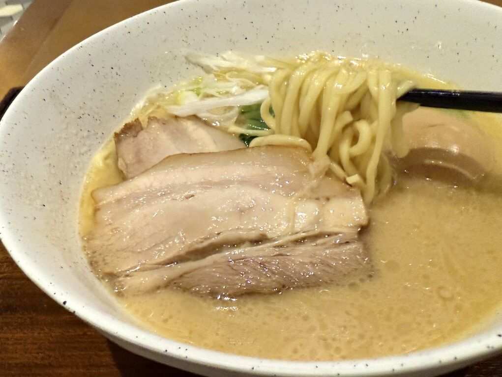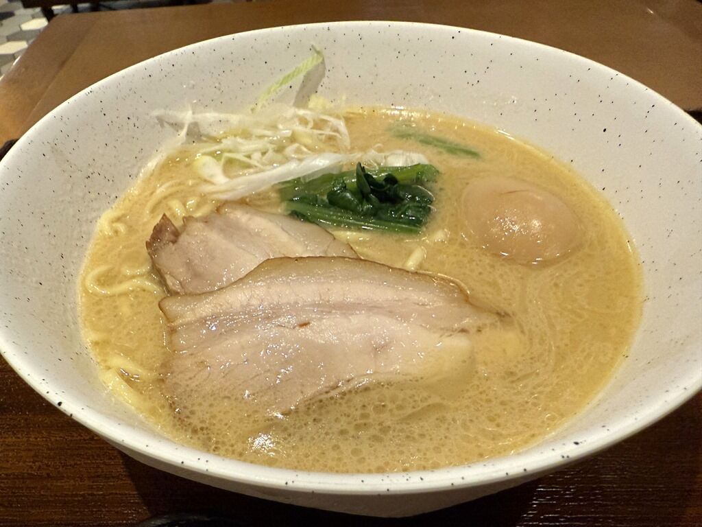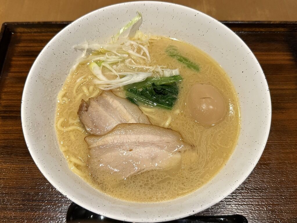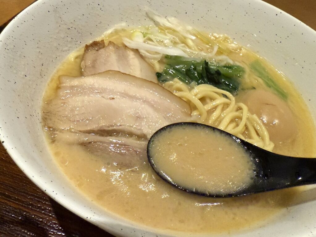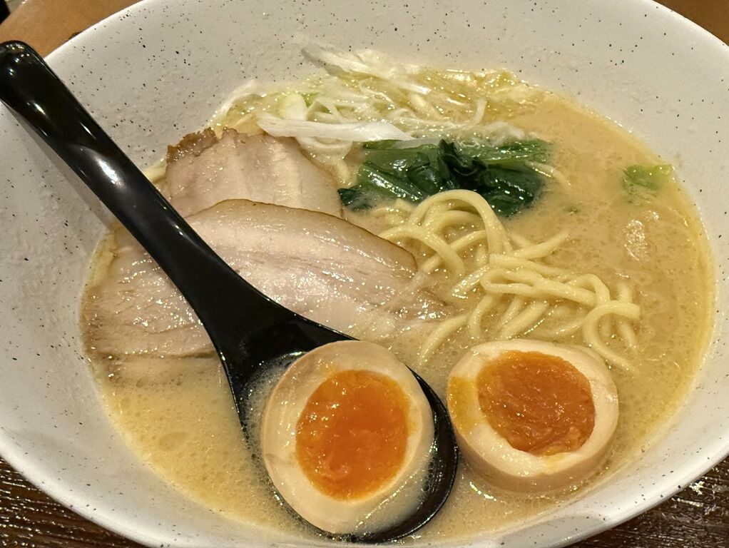 具は前田美豚」のバラ三枚肉チャーシュー、青菜、味玉、笹切りねぎ。1000円以下でデフォで味玉付き。