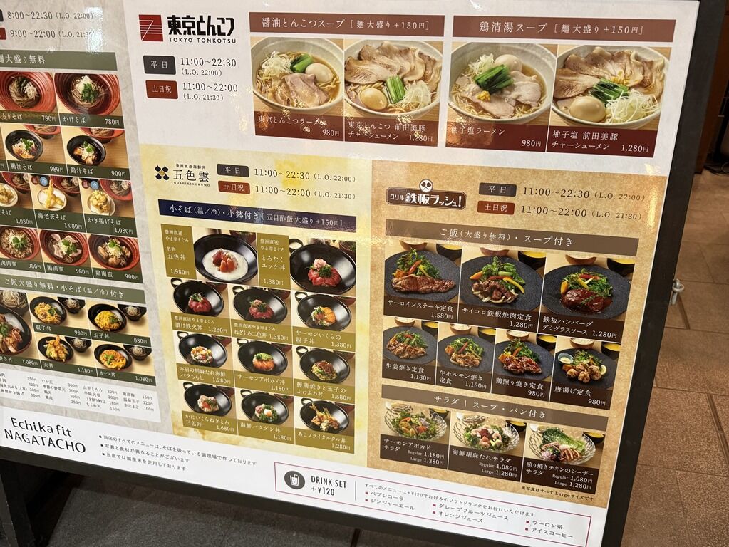 エリア的には、 こく旨肉そば 日の陣、 東京とんこつ、豊洲直送海鮮丼 五色雲、グリル 鉄板ラッシュの4軒がキッチンと飲食スペースが同一。