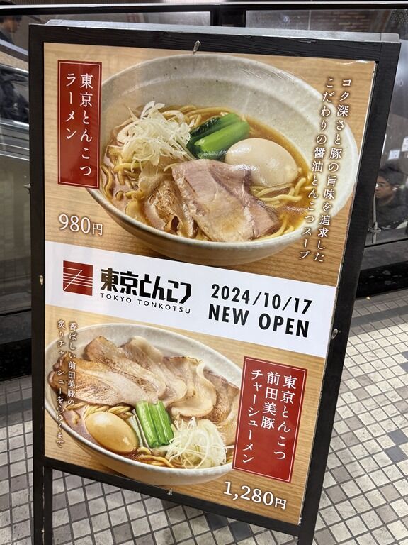 「東京とんこつ」の主なメニューは、東京とんこつラーメン980円、東京とんこつ前田美豚チャーシューメン1280円、柚子塩ラーメン980円、柚子塩前田美豚チャーシューメン1280円。