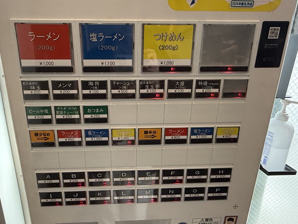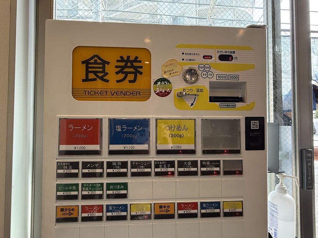 定刻1分前嬉しい早開けオープン。入店するとまず券売機で食券購入です。主なメニューは、ラーメン1000円、塩ラーメン1100円、つけめん1050円(準備中)、他。