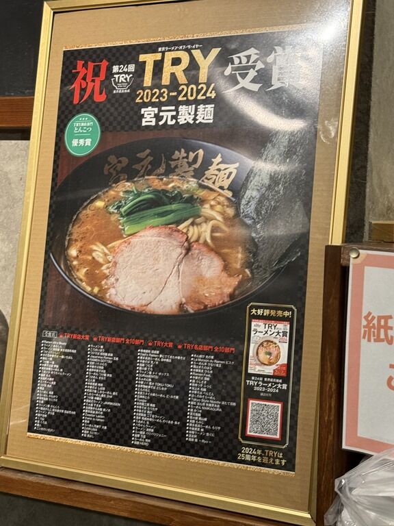 「宮元製麺」は2023年3月19日オープン。当初は宮元流超濃厚家系的なラーメンを提供。第24回TRYラーメン大賞2023-24新店部門とんこつ第7位入賞。