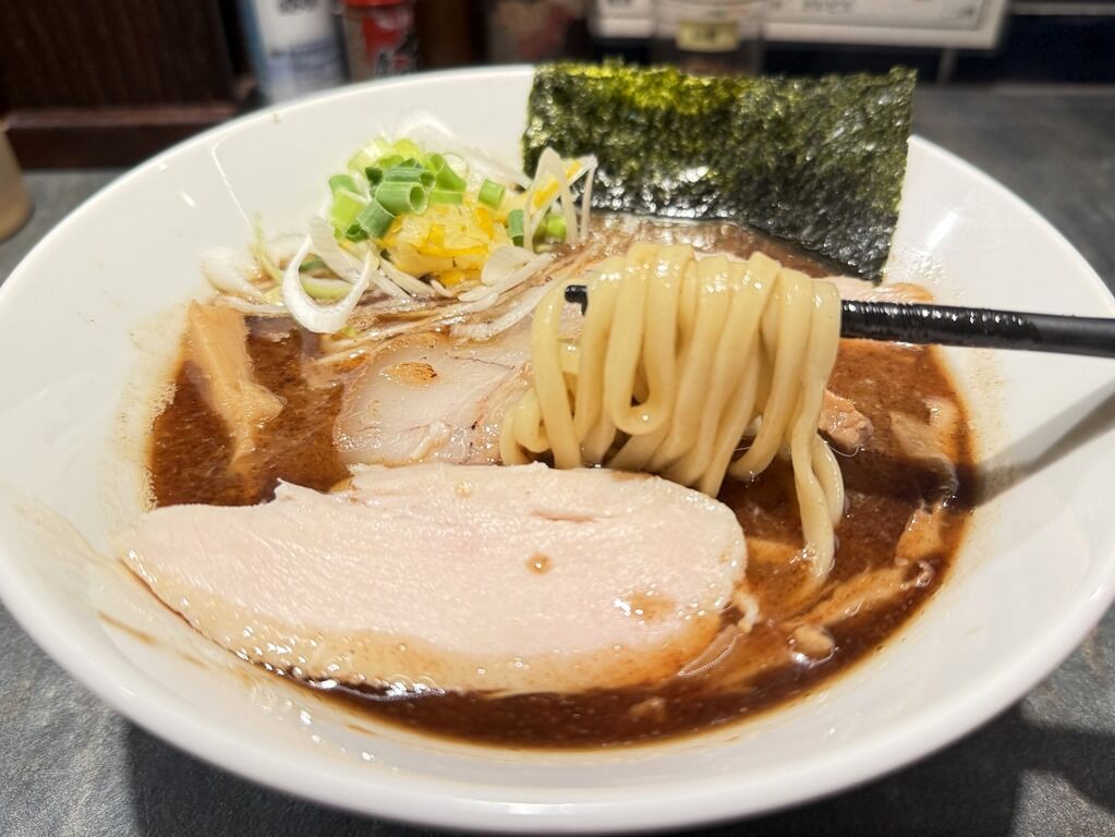 自家製の麺はストレート中太タイプ。表面ツルスベ、食感はシコシコ。麺の旨さも水準以上です。