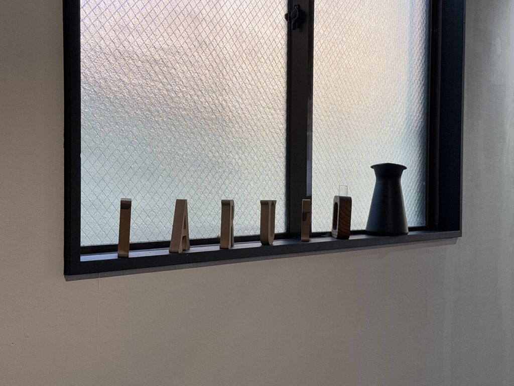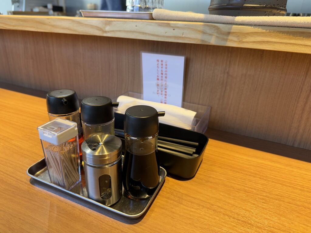 BGMは女性ボーカルジャズ。箸は洗い箸でサスティナブルに配慮。卓上調味料はラー油、酢、醤油、胡椒。