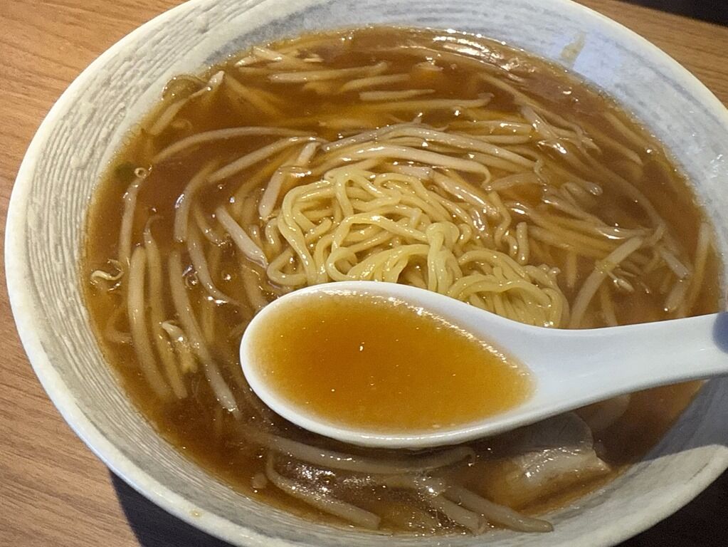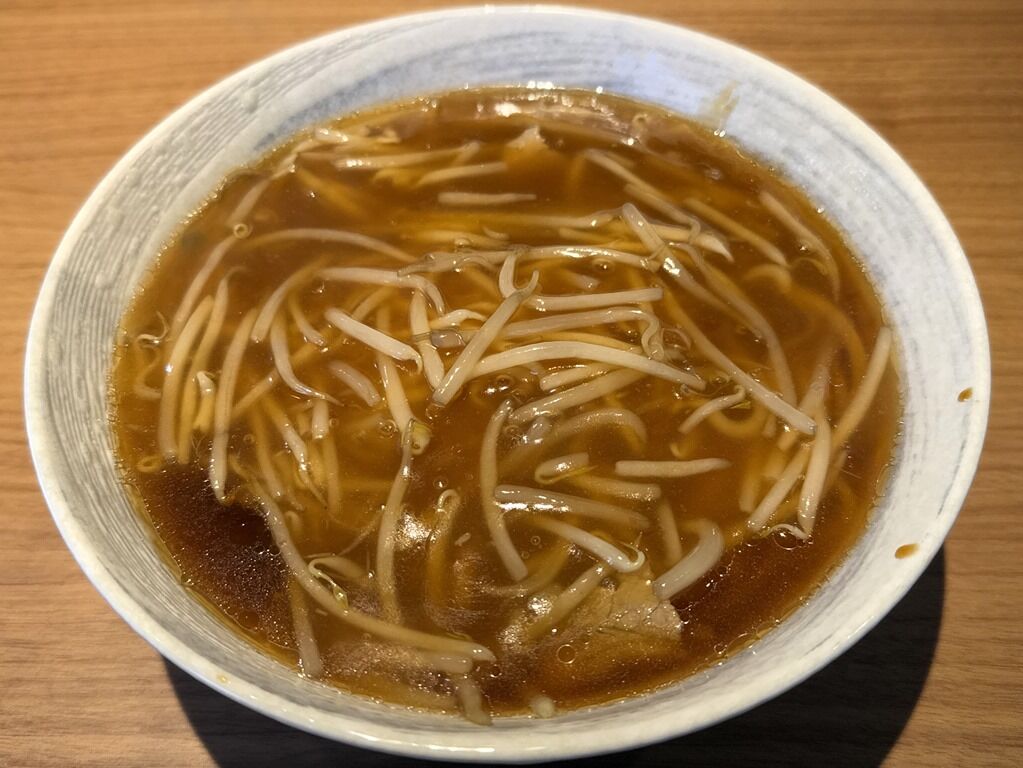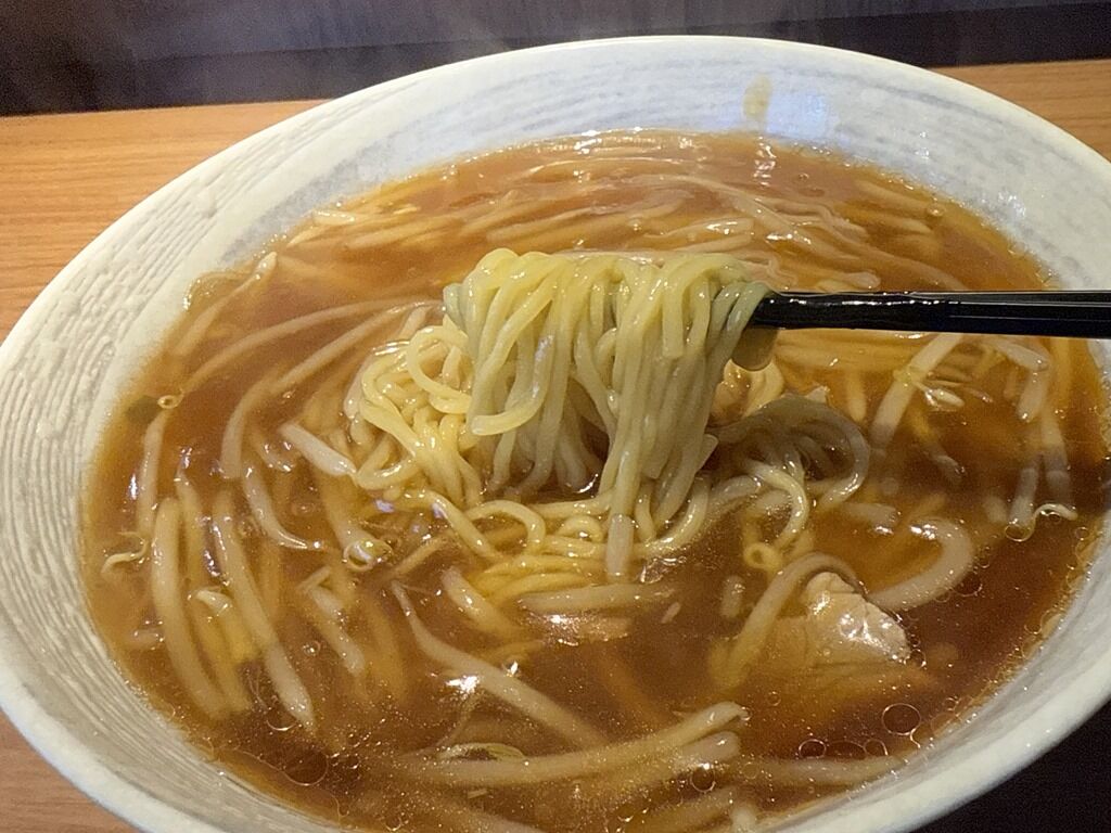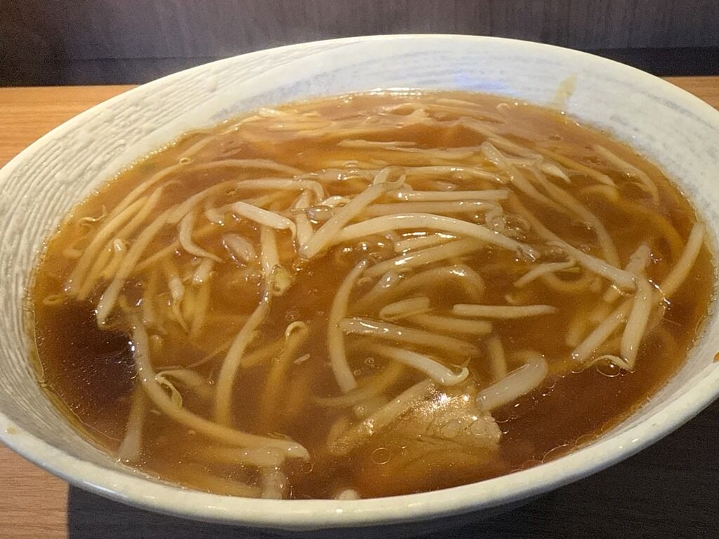 スープはさらさらの清湯醬油味。豚骨・鶏ガラ出汁に醤油ダレ。とろみ餡が混ざらないそのままのスープは、昔ながらのこれぞ東京醤油ラーメンといった味わいで美味。餡が混ざると炒めもやしの香ばしさがスープに移って、香味がぐーんとアップ。永年愛され続けるのも納得の味ですごく美味しい!