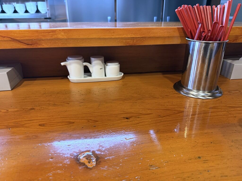 BGMはJ-POP。箸は赤い洗い箸でサスティナブルに配慮。ちなみにレンゲも赤。卓上調味料は醤油、酢、ラー油。