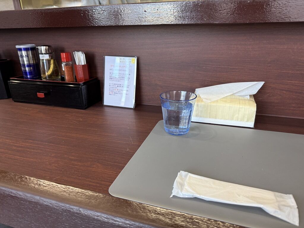 BGMはJ-POP。箸は洗い箸でサスティナブルに配慮。卓上調味料はGABANブラックペッパー、煮干し酢、一味唐辛子。