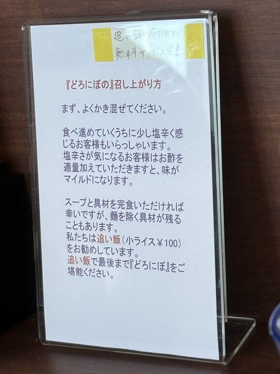 麺を食べ終えるとやはりスープが結構余ります。サービス中の追い飯を勧められましたが、次があるので丁重に辞退。