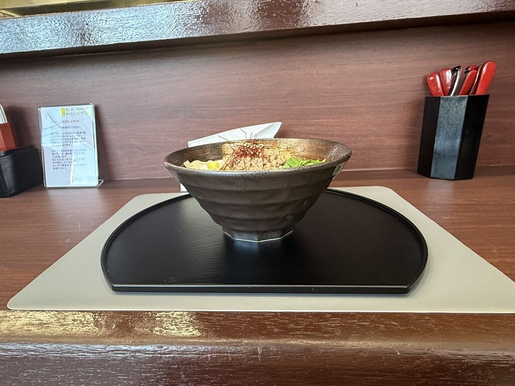 パスタ用かっていう丸くて長い大きなテボで、タイマーが鳴る10秒以上前に麺上げ。元々テーブルにランチョンマットが敷いてありますが、表面に凹凸のある和風の鳴門丼が、半月型のお盆に載って着丼。