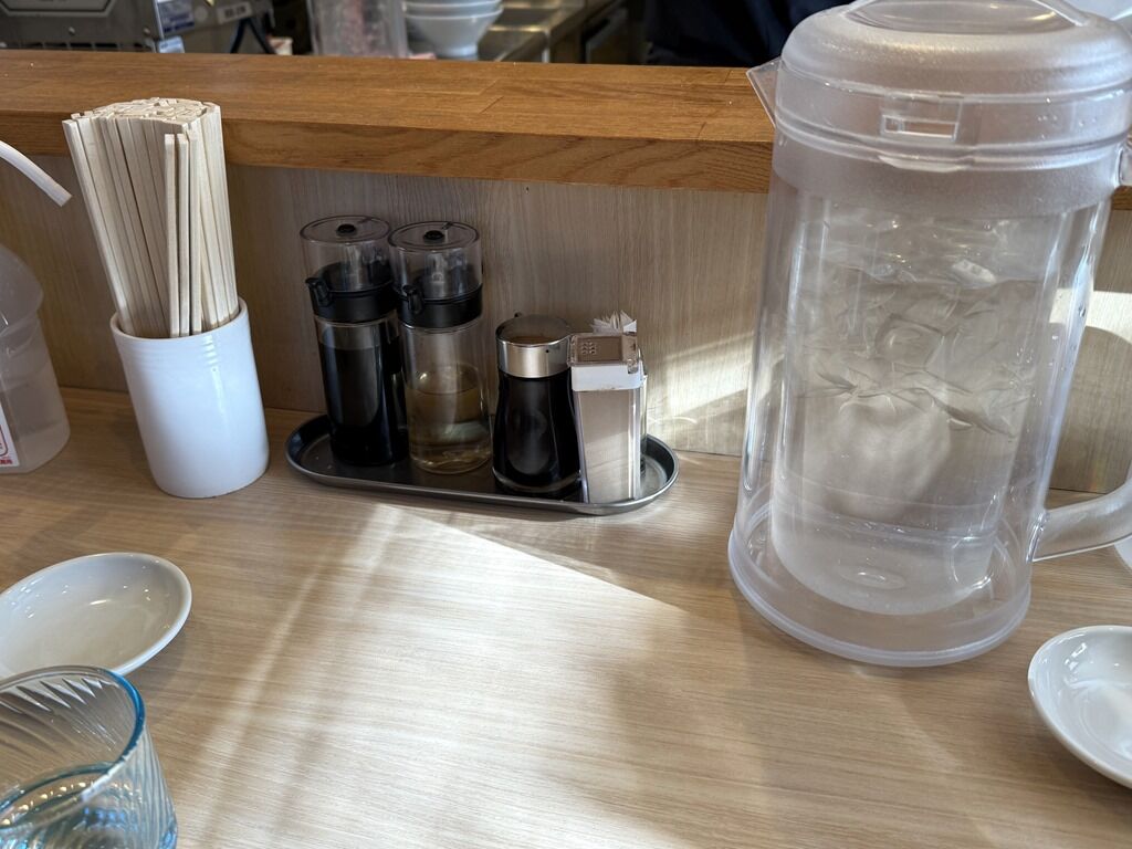 BGMはJ-POP。箸は割り箸。卓上調味料は醤油、酢、ラー油、白胡椒。