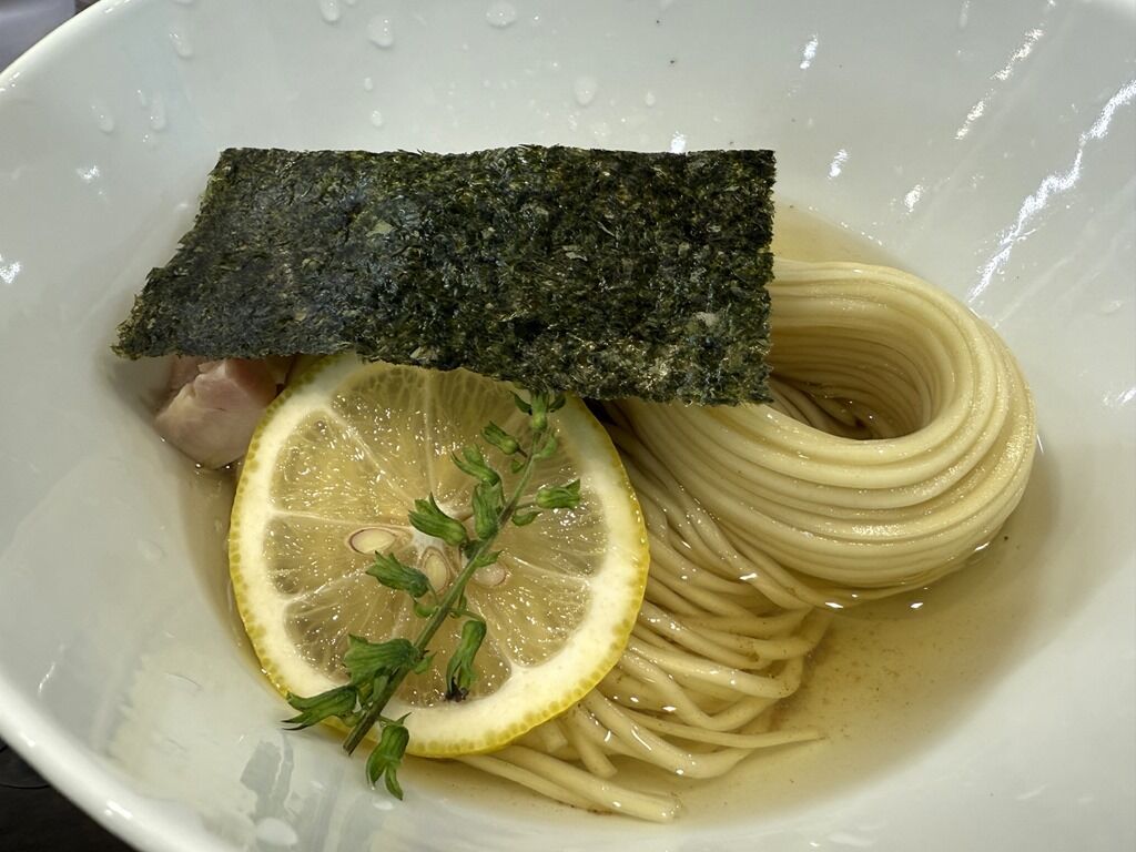 具はつけ汁にたっぷりのスライス吊し焼きチャーシュー、細笹切りねぎ。麺の上にスライスレモン、紫蘇の実、サイコロ鶏チャーシュー、海苔。