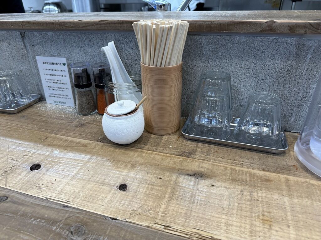 BGMはポップス。箸は割り箸。卓上調味料は藻塩、ブラックペッパー、一味唐辛子。