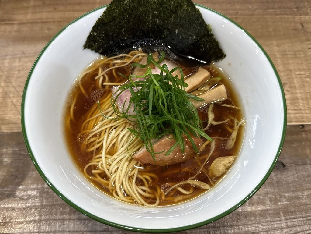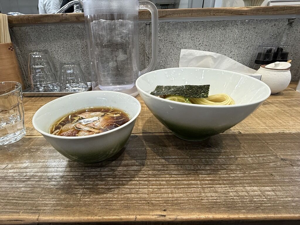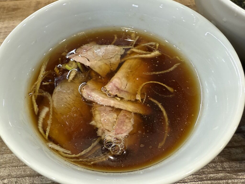 つけ汁はさらさらの清湯醤油味。動物性ベースの出汁に鶏油がが効いて、うま味たっぷり、飲み干したくなる味わい。