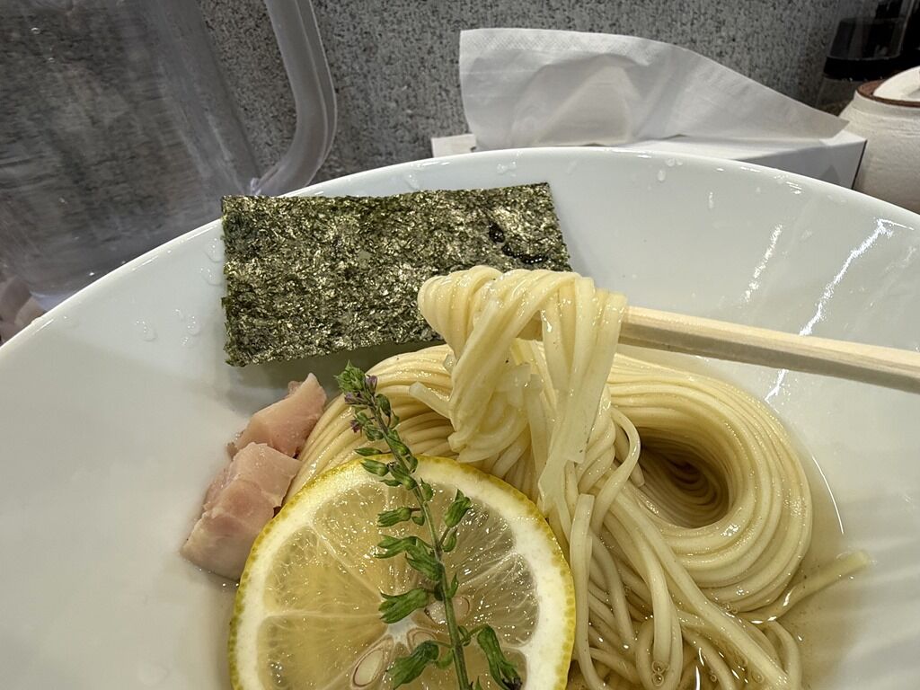 昆布水に浸かった麺はストレート中細タイプ。美しいS字カーブを描くようきれいに整えられています。