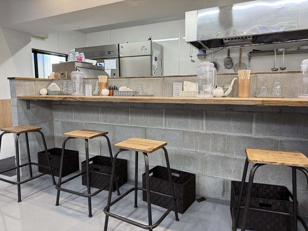 店内は厨房前に真っ直ぐなカウンター7席、中待ちベンチ6席。カウンターはL字で短辺側椅子1脚ありますが不使用。