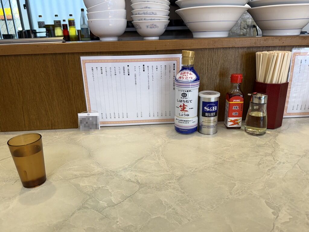 箸は割り箸。卓上調味料はキッコーマンしぼりたて生しょうゆ、S&Bホワイトペッパー、YOUKI辣油、酢。