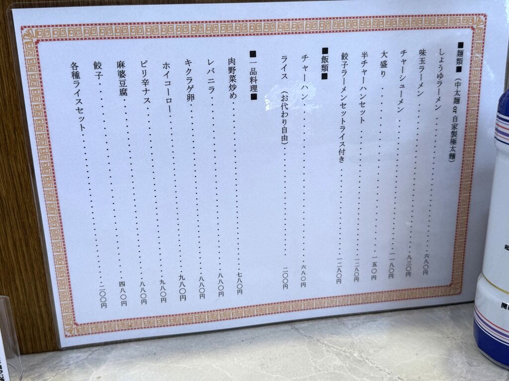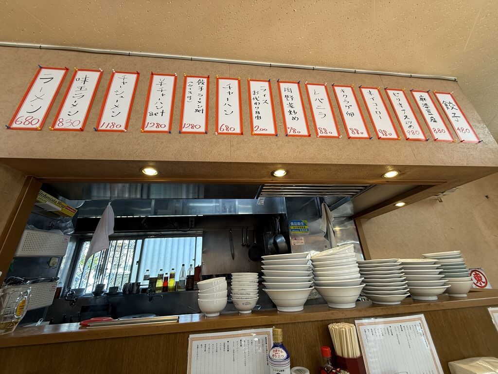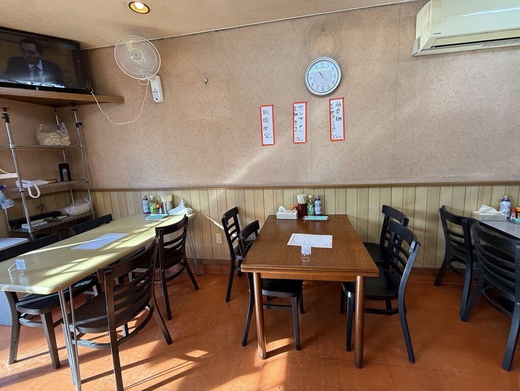 店内は厨房を囲むL字型カウンター5席(3・2)、4人卓x5。後客6。厨房に気さくで明るい店主さん、ホール担当の女性2の3名体制。調理は餃子以外すべて店主さん担当で、ロットによってラーメンかチャーハンの調理。ラーメンは在店時1ロット4杯。チャーハンは半チャーハン2杯かフルチャーハン1杯で進行。