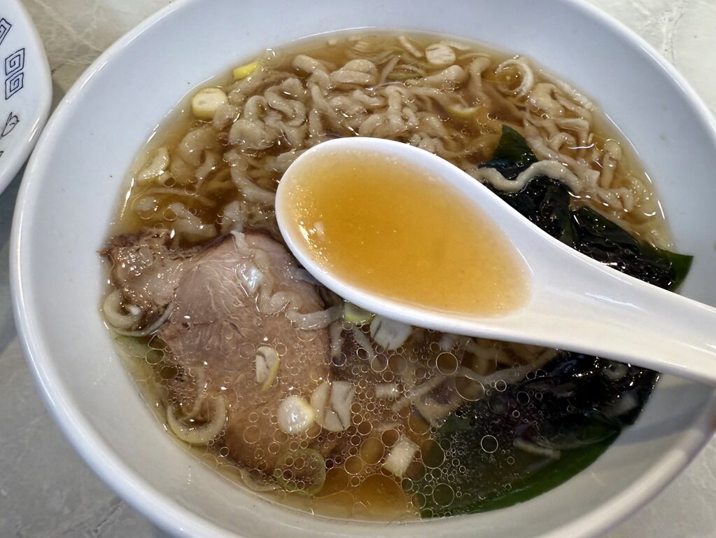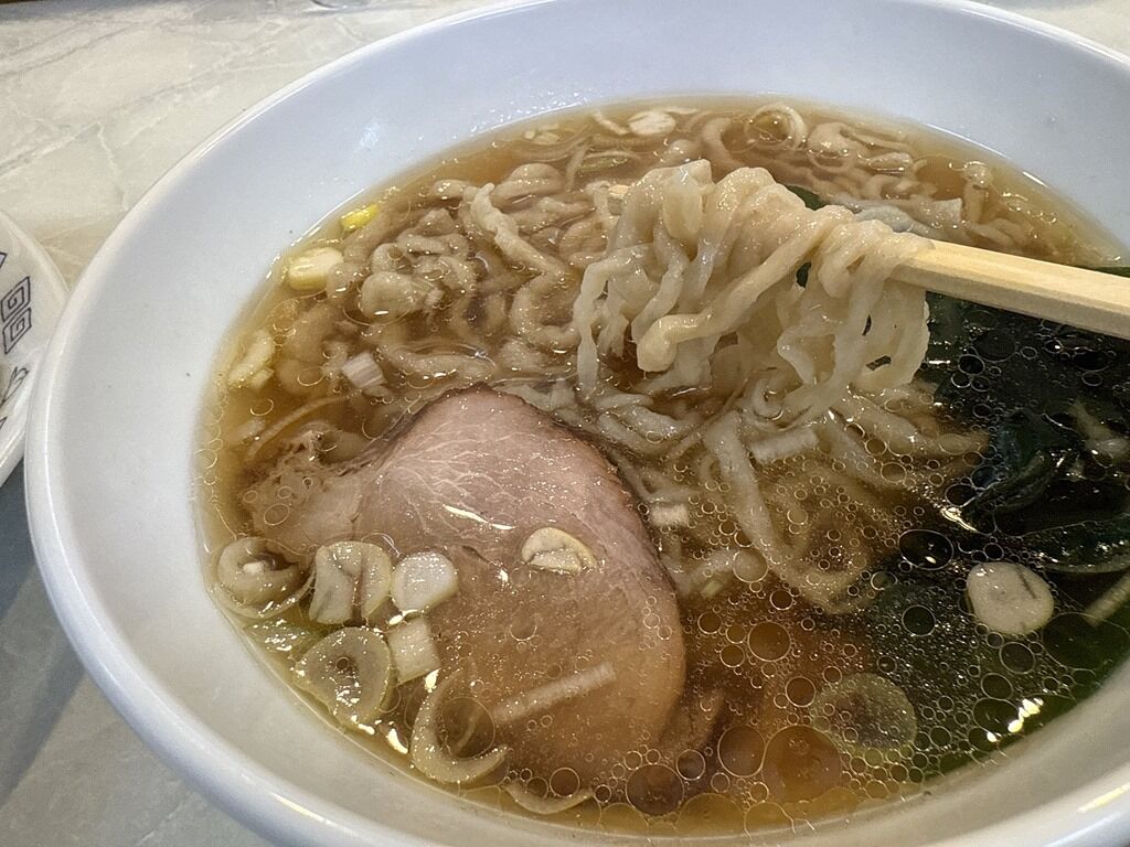 スープはさらさらの清湯醤油味。鶏ベースと思われるあっさり動物性出汁にほんのり煮干香る、まさに町中華らしい優しい味わい。普段あまりラーメン食べない人がラーメンでも食べるかってイメージしそうな、いい意味でこれぞな味わい。ノスラーの雰囲気もあってとても美味しい!