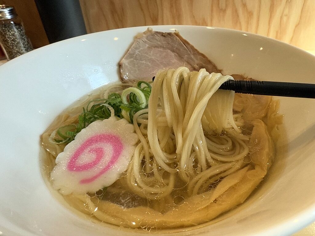 スープはさらさらの清湯塩味。煮干ベースですが、タレにふくよかでまろやかな貝の旨味を感じる芳醇にして豊潤な和風出汁。派手さやインパクトはありませんが、しみじみとじんわり沁みる味わいでとても美味しい!