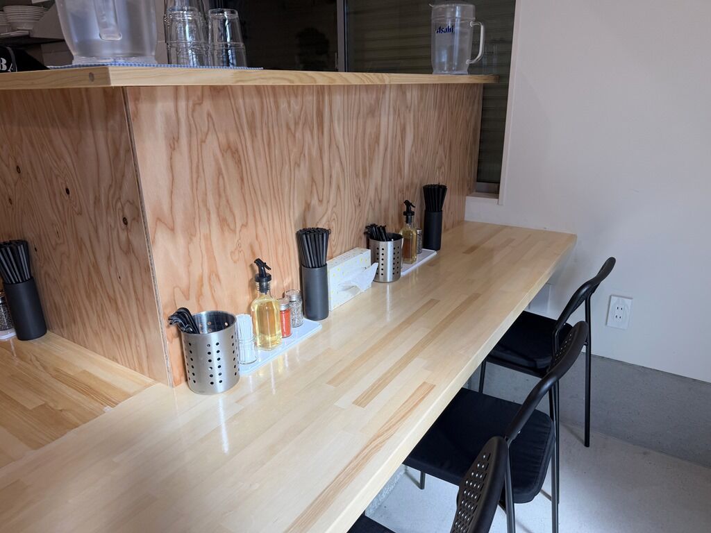 BGMは無し。箸は洗い箸でサスティナビリティに配慮。卓上調味料は酢、一味唐辛子、ミックスペッパー。