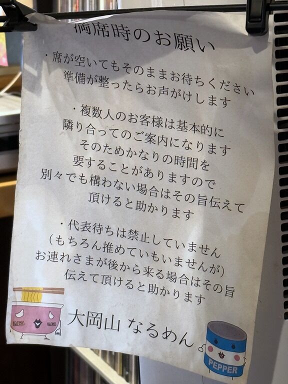入店すると正面に券売機がありますが、設定されてないのでそのまま店内へ。満席時は中で待機、仮に席が空いていても勝手に座らず案内を待ちましょう。