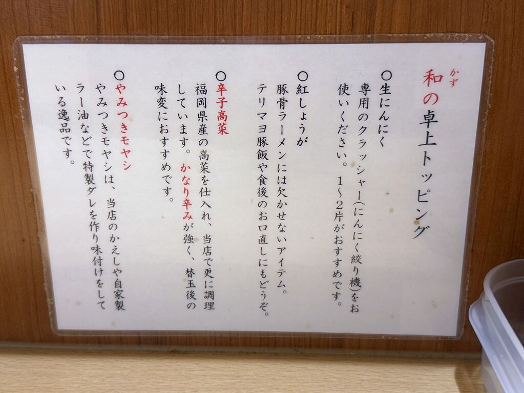 替玉推奨の博多ラーメンでも、いつもスープをたっぷり飲んじゃうので替玉出来るほどスープが残らないのですが(今回もそう)、豊富にある味変アイテムで油そばとしていただこうともくろみ替玉ゲット。タレを軸に、次々と調味料や薬味を投入して、油そばカスタムも美味!