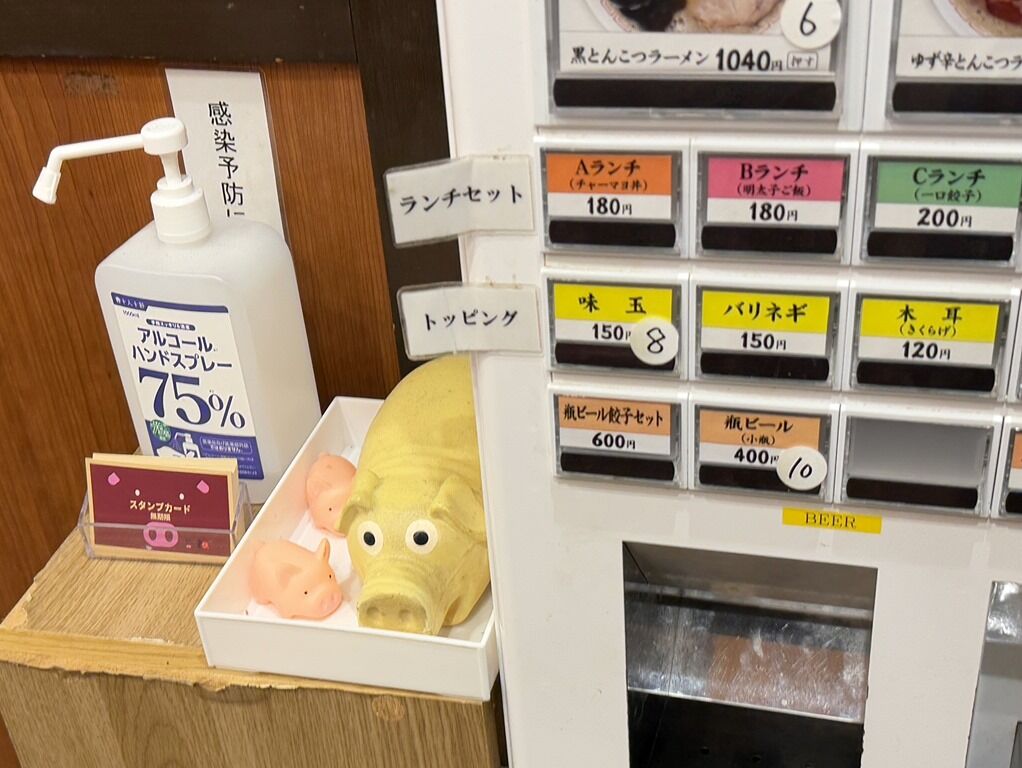 厨房に店主さんとサポートの男性の2名体制。箸は洗い箸でサスティナブルに配慮。スタンプカードは豚の顔のデザイン。