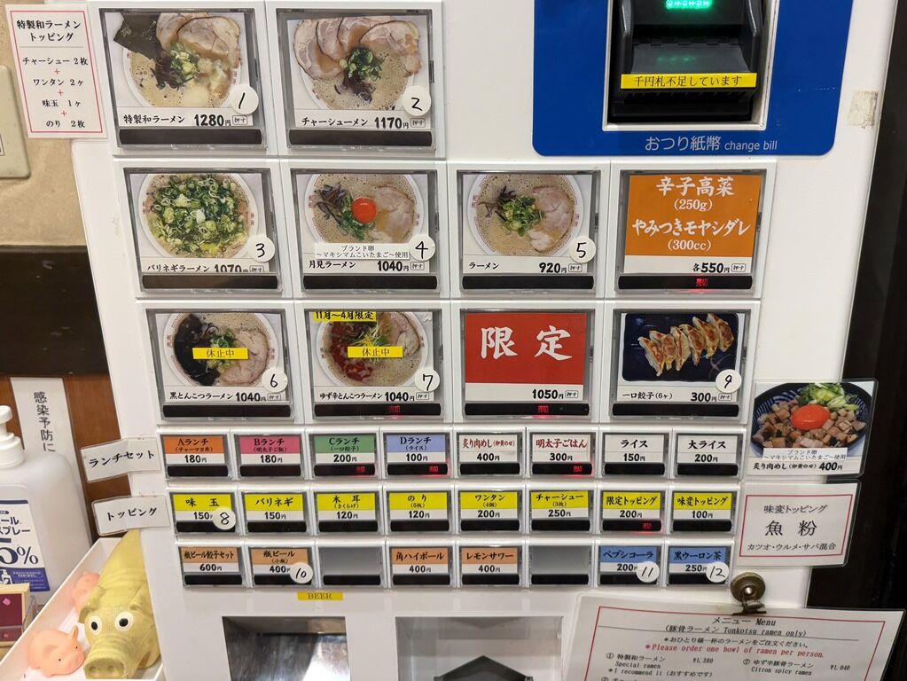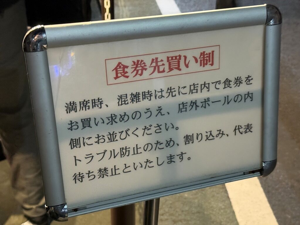 夜の部定刻1分前到着でシャッター待ちの先客4に接続。定刻2分過ぎオープン。順番に店内へ。入店するとまず券売機で食券購入です。なお、満席時は先に食券買ってから列ぶ方式。