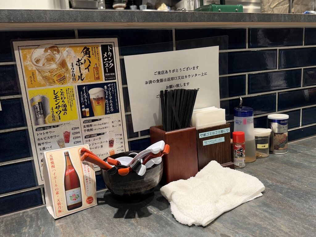 BGMはJ-POP、決意の朝に、LOVE2000、他♪箸は洗い箸でサスティナブルに配慮。卓上調味料はS&B七味唐辛子、酢、山椒、GABANブラックペッパー。
