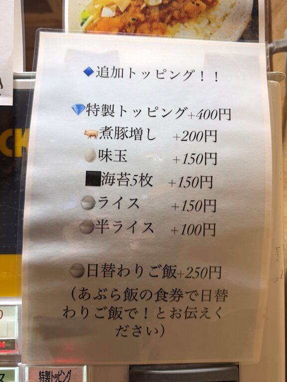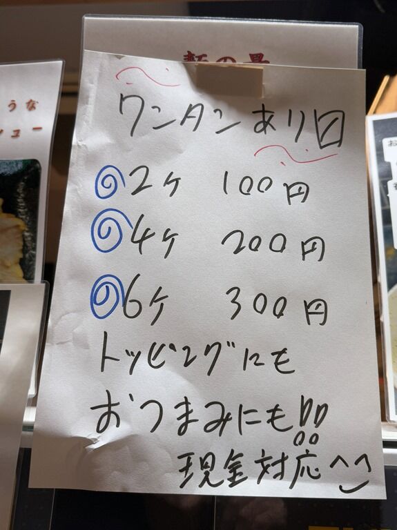 本日の特別トッピングとして、ワンタン2個100円〜。