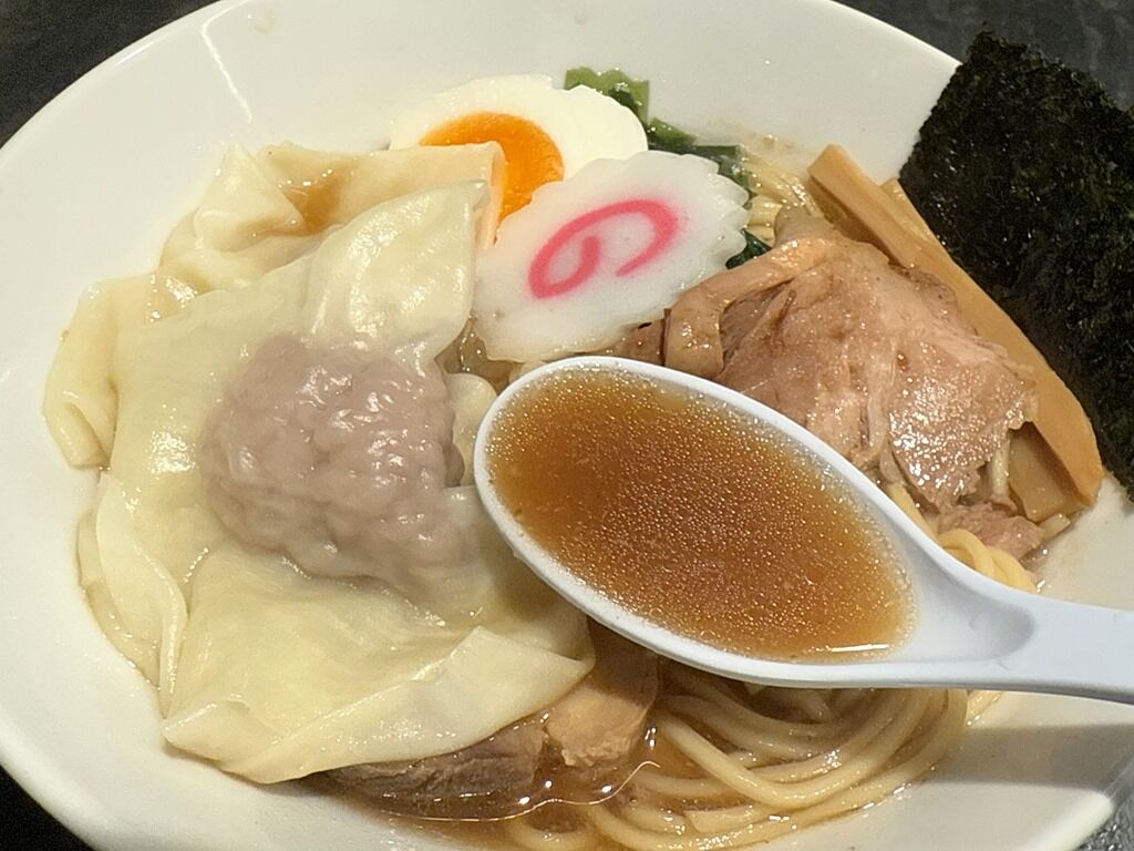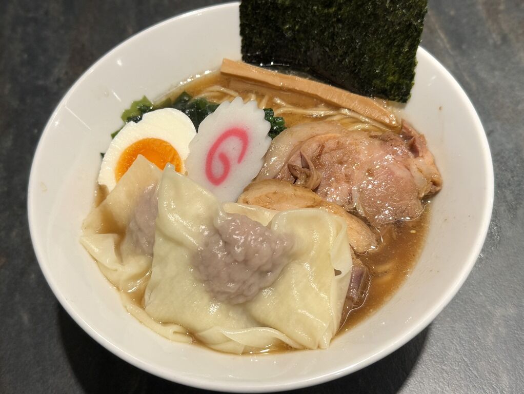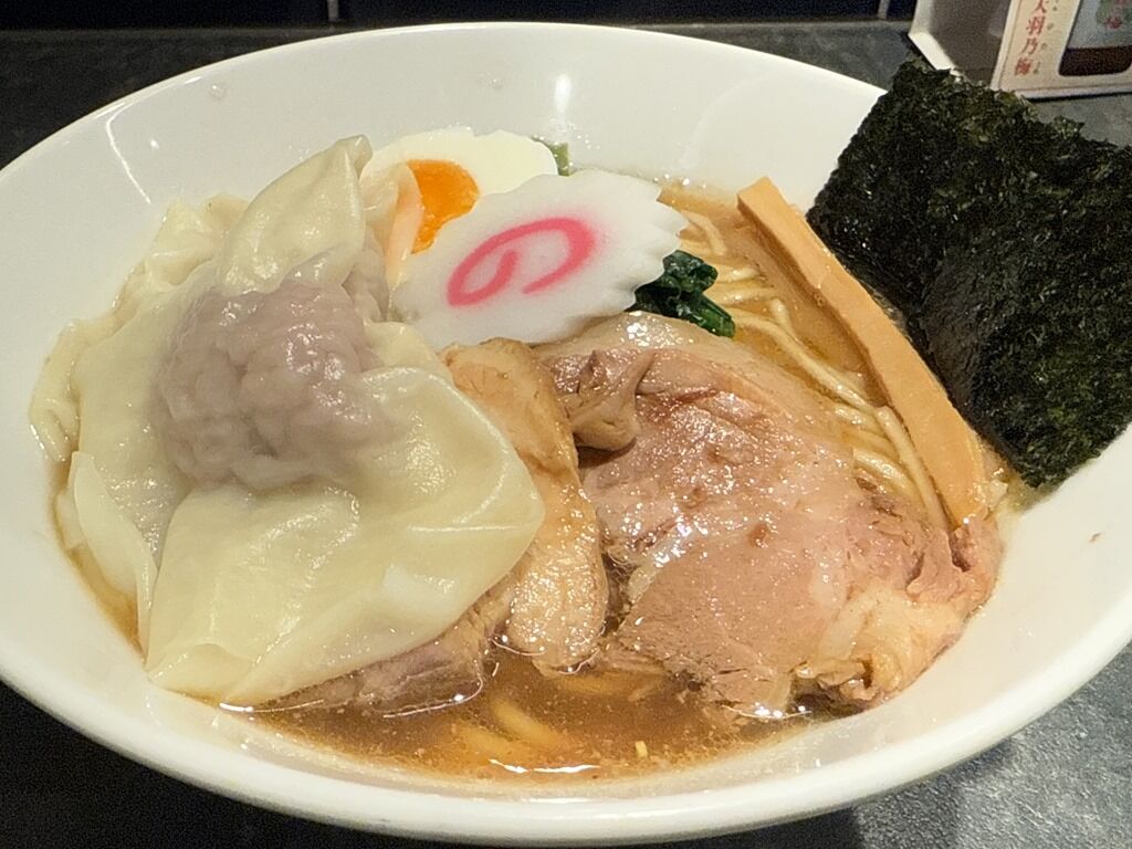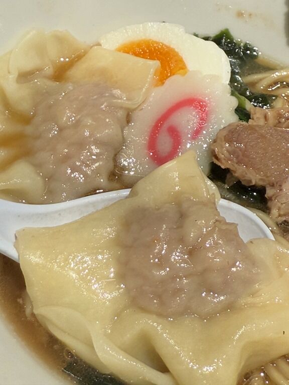 限定トッピングのワンタンは、てるてる坊主の頭に当たる部分が超デカくて、まるで焼売に尾ひれを付けたかの様。肉餡がたっぷりぎっしり詰まって美味!