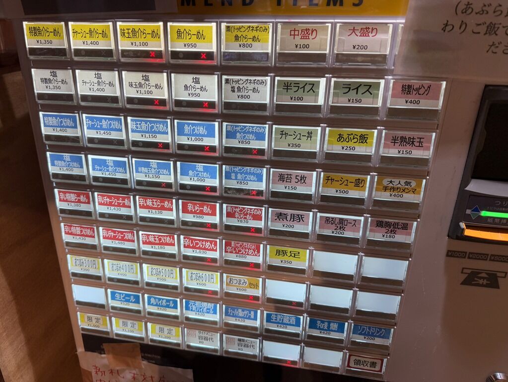 食券購入は、券売機で左一番下限定1100円のボタン。後述しますが、ワンタンがデカくて旨くてこの価格は破格の安さ。