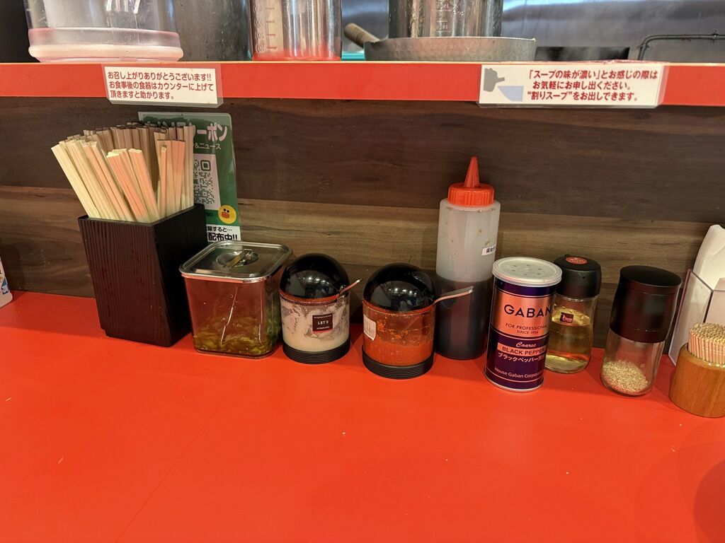 箸は割り箸。卓上調味料・薬味は青かっぱ、おろしニンニク、豆板醤、醤油ダレ、GABANブラックペッパー、酢、擦り胡麻。
