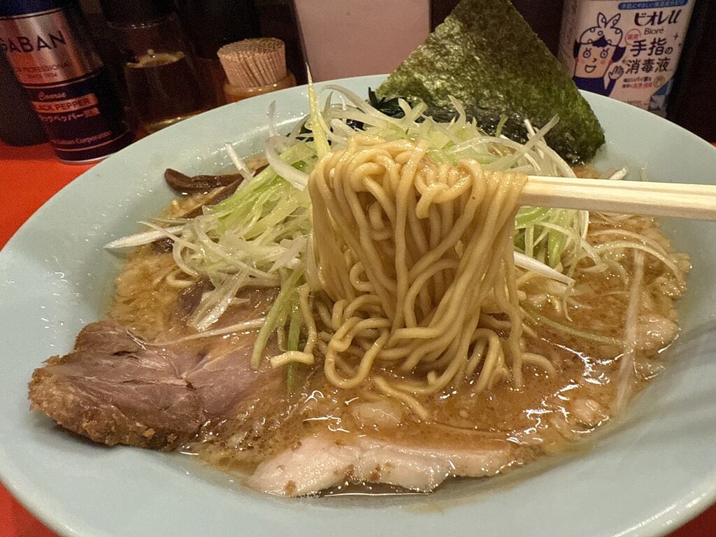 麺は中細縮れタイプ。スープの力強さに比して麺の便りなさげなところはまさにラーショらしくて、ちょっとゆで過ぎなところや、スープと麺のアンバランスさ、それもまたいい味のうち。